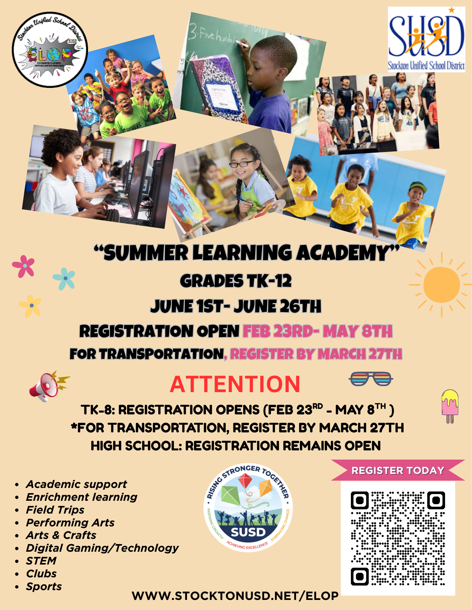 SUSD Summer Learning Academy for Grades TK-12 - June 1-26, 2026 (Registration Opens Feb. 23-May 8)